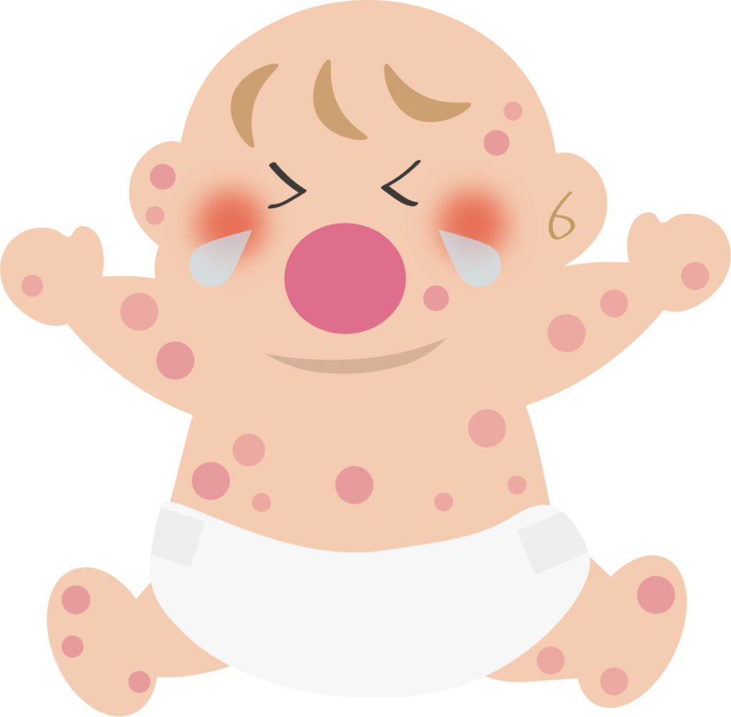 発疹は顔、首回り、太ももとおなかに出ました。合計でも20個程度。気にして搔くようなこともなかったです。ぐずりもせず、ご機嫌。